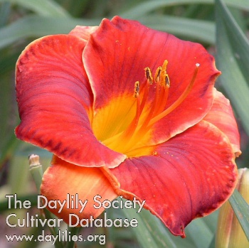 | Description : Chinese red with wire gold edge above yellow to chartreuse throat | |