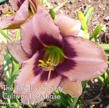 | Description : pink cream blend with violet purple slate gray lavender eye above olive green throat | |