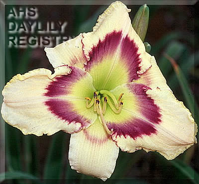 | Description : cream lavender with rose band and lavender blue eye with lavender rose edge above green throat | |
