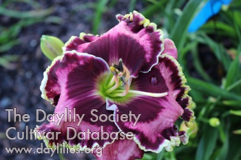 | Description : orchid pink base with dark purple eye,with orange throat, green heart, with thick purple, orange gold edge | |