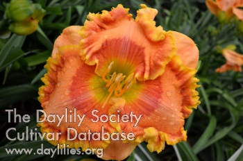 | Description : Cream pink apricot bitone with light pink apricot sepals, large glowing celery green throat, outlined in light orange, darker pink, then ringed in magenta, triple edging of magenta, medium pink then bright lemon, diamond dusted. | |