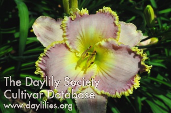 | Description : Deep rose pink with watermark above a very large green throat, double edge of ruffled white and spiky green. | |