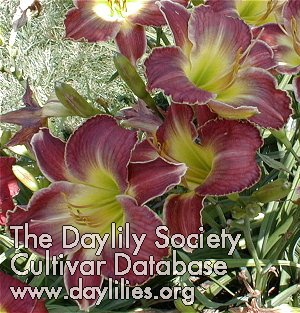 | Description : Light burgundy purple with a darker band above a yellow to green throat, cristate tissue on forty to fifty percent of blooms. | |