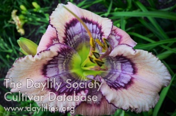 | Description : Flesh pink with rings and chevrons of raspberry, silver, lilac purple above a green throat, pattern extends onto darker pink sepals, edged in raspberry and purple. | |