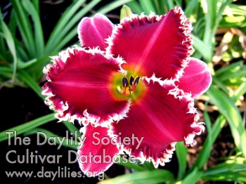 | Description : Bright red with white teeth, yellow and green throat. | |