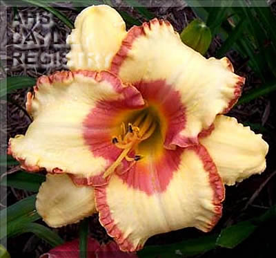 | Description : cream pink with rose pink eye and rose pink gold edge above yellow to green throat | |