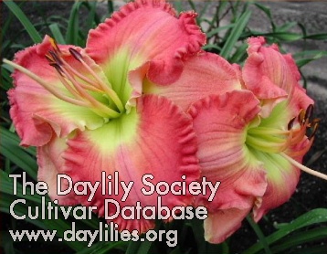 | Description : bright red pink self with ruffled edge above yellow throat | |