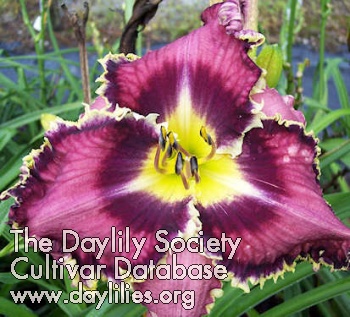 | Description : black purple with black eye and edge, white teeth, above a green throat | |