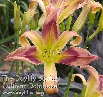 | Description : maroon bicolor with yellow midrib above green yellow throat | |