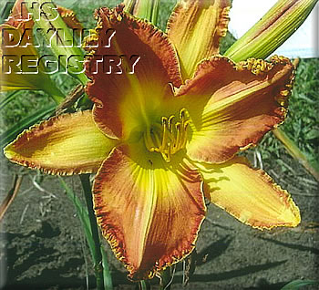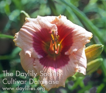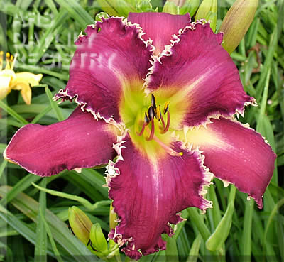| Description : regally tall, electric purple with very large white shark's teeth with a green over yellow throat | |